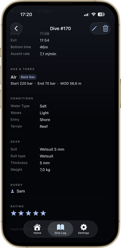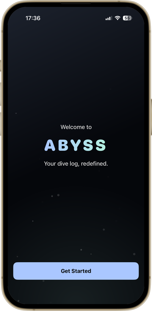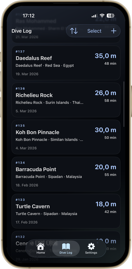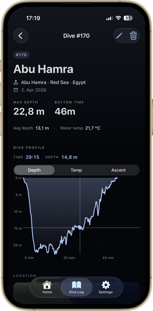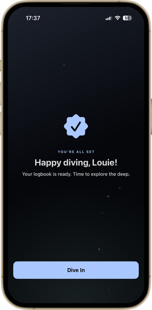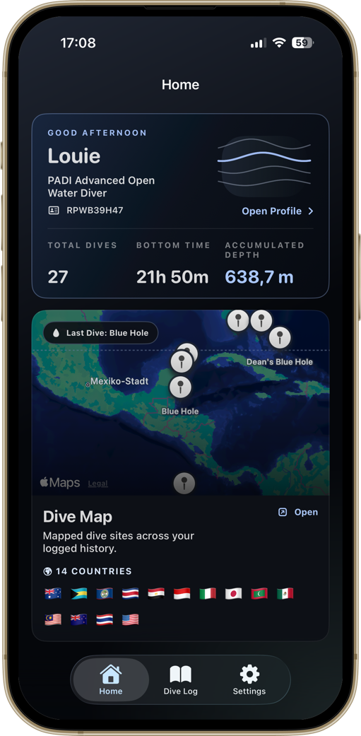 A diver-first home screen. Your certification, the numbers that matter, and your most recent dive — always one tap away.