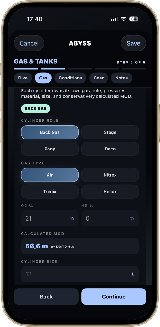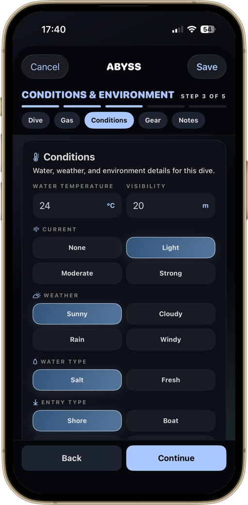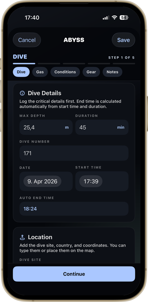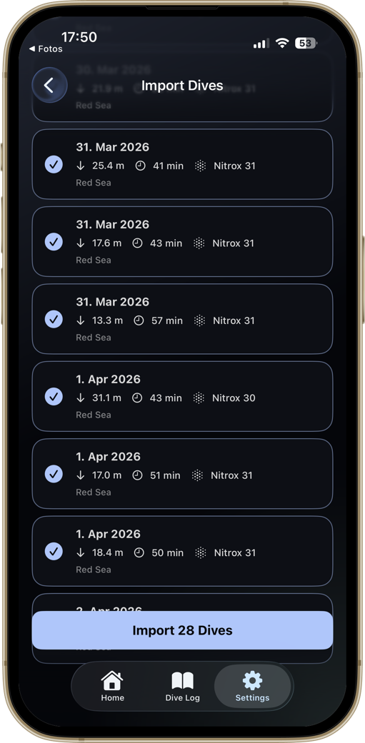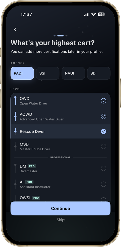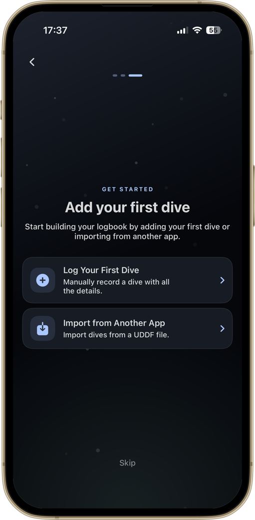 A diver-first home screen. Your certification, the numbers that matter, and your most recent dive — always one tap away.