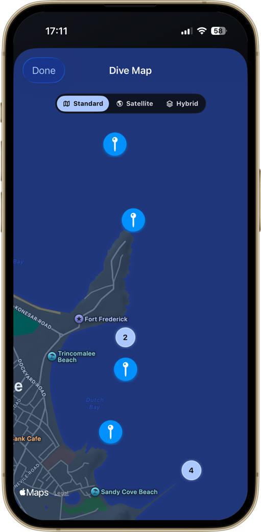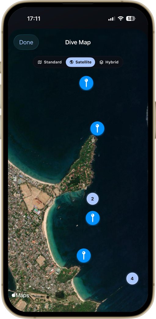 - Quick access to your last dive and your map